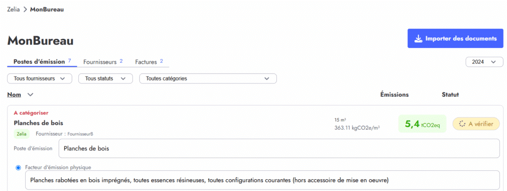Grâce au bouton Importer des documents, Zelia propose automatiquement des facteurs d’émissions possibles :
